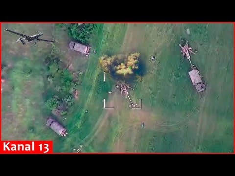 The video contains aerial footage of what appears to be a self-propelled howitzer firing shells from the cover of trees, which obstruct the weapon.